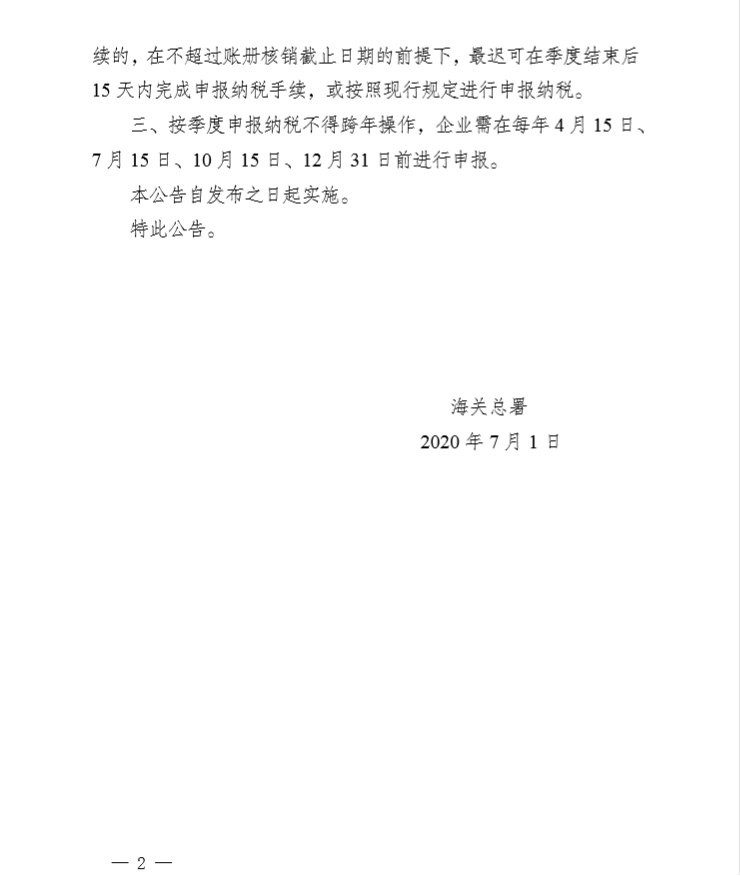 接下来给大家对海关总署公告2020年第78号提及的三点内容进行解读。 “对符合条件按月办理内销申报纳税手续的海关特殊监管区域外加工贸易企业,在不超过手册有效期或账册核销截止日期的前提下,最迟可在季度结束后15天内完成申报纳税手续。” 1. 什么是加工贸易内销集中征税? 加工贸易内销集中征税是指符合条件的加工贸易企业先行内销加工贸易保税货物,再集中向主管海关办理内销纳税手续。 实施内销集中征税前,加工贸易企业采用“先征后销”的方式向海关申请内销,允许加工贸易企业内销集中征税,将“先征税再出货”变为“先出货再征税”,能够引导企业更好地面向国际、国内两个市场,延长加工贸易国内产业链,为符合条件的加工贸易企业拓展内销市场赢得宝贵的时间。 2. 申请加工贸易内销集中征税的条件 (1)区外联网监管企业(E账册企业)、区外以企业为单元企业(以企业为单元账册企业); (2)区外非联网监管的一般认证及以上企业,无需提供担保,事先向海关提交《集中办理内销征税手续情况表》备案即可; (3)区外非联网监管的一般信用企业,向海关提供有效担保后,可实施内销集中征税。 担保计算方式:一般信用企业保证金(保函)金额=企业计划月内销纳税金额×50% 3. 加工贸易内销集中征税的申报时间 新政策实施前:符合条件集中办理内销征税手续的海关特殊监管区域外加工贸易企业,应于每月15日前对上月内销情况进行保税核注清单及报关单的集中申报,但集中申报不得超过手(账)册有效期或核销截止日期,且不得跨年申报。 新政策实施后:对符合条件可集中办理内销征税手续的加工贸易企业,在不超过手(账)册有效期或核销截止日期的前提下,最迟可在季度结束后15天内向海关申报完成纳税手续。新政策实施后,企业准备内销征税资金的时间得到进一步放宽,内销手续进一步简化,出口转内销获得更多便利。 “海关特殊监管区域内加工贸易企业,采用‘分送集报’方式办理出区进入中华人民共和国关境内(海关特殊监管区域外)手续的,在不超过账册核销截止日期的前提下,最迟可在季度结束后15天内完成申报纳税手续,或按照现行规定进行申报纳税。” 1. 什么是海关特殊监管区域“分送集报”方式 “分送集报”是指海关特殊监管区域内企业(以下简称“区内企业”)与境内区外企业(以下简称“区外企业”)分批次进出货物的,可以先凭出入库单办理货物的实际进出区手续,再在规定期限内集中办理报关手续。 2. 申请分送集报的条件 (1)在海关特殊监管区域内注册的一般信用及以上企业; (2)企业应建立符合海关监管要求的计算机管理系统。 3. “分送集报”业务流程 (1)符合条件的区内企业开展“分送集报”业务的,通过金关二期加贸及保税管理子系统(以下简称“金二系统”)向海关提交“分送集报”的业务申报表。 (2)货物分批进出区时,区内企业通过金二系统向海关发送出入库单,捆绑核放单,办理进出区手续。 (3)区内企业在规定时限内通过金二系统将批次进出区货物的出入库单汇总为保税核注清单。区外企业在规定期限内办理集中申报手续,填报进出口货物报关单。 (4)区内企业根据业务申请表的有效期限向海关办理业务申报表结案手续。 4. “分送集报”方式下企业申报纳税期限 新政策实施前:海关特殊监管区域内加工贸易企业,采用“分送集报”方式办理出区进入中华人民共和国关境内(海关特殊监管区域外)手续的,应当对1个自然月内的分批出区数据进行归并,填制核注清单,区外收货企业填制进口报关单,在次月底前向海关办理集中申报纳税手续(对分送集报期限另有规定的海关特殊监管区域除外)。 新政策实施后:海关特殊监管区域内加工贸易企业,采用“分送集报”方式办理出区进入中华人民共和国关境内(海关特殊监管区域外)手续的,在不超过账册核销截止日期的前提下,由每月申报,调整为最长可按季度申报,企业可以选择在每个季度结束后15天内完成申报纳税手续,或按照现行规定进行申报纳税。 “按季度申报纳税不得跨年操作,企业需在每年4月15日、7月15日、10月15日、12月31日前进行申报。” 为什么不能跨年操作? 进出口商品税则号列、税率、汇率等通常在年底进行调整,如跨年申报操作,很可能导致手(账)册内容和报关单内容不一致,造成退单等问题。此外,部分企业采用“分送集报”模式进行申报,要求“分送”和“集报”单证比对一致,跨年申报时需要对“分送”单证逐票进行调整。