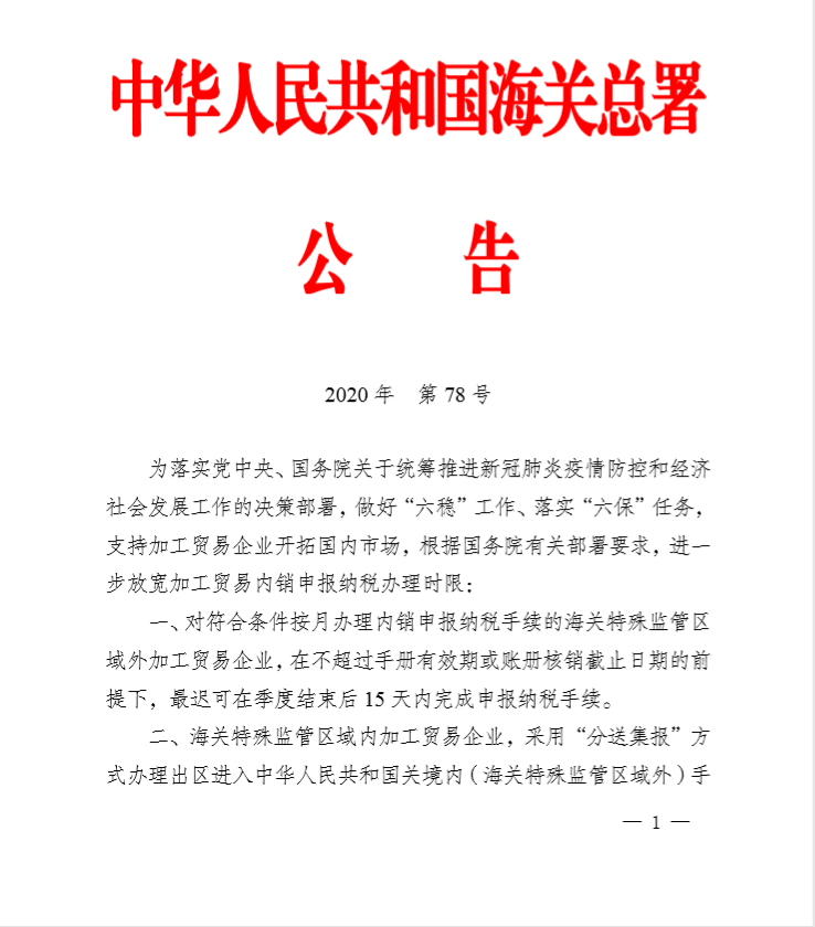 为深入贯彻落实党中央、国务院关于统筹推进新冠肺炎疫情防控和经济社会发展工作的决策部署,做好“六稳”工作,落实“六保”任务,在鼓励企业拓展国际市场的同时,支持适销对路的出口产品开拓国内市场,着力帮扶外贸企业渡过难关,促进外贸基本稳定,根据《国务院办公厅关于支持出口产品转内销的实施意见》,海关总署发布了《关于调整加工贸易内销申报纳税办理时限的公告》(海关总署公告2020年第78号),通过调整加工贸易内销申报纳税时限,进一步加大对加贸企业内销的支持力度。