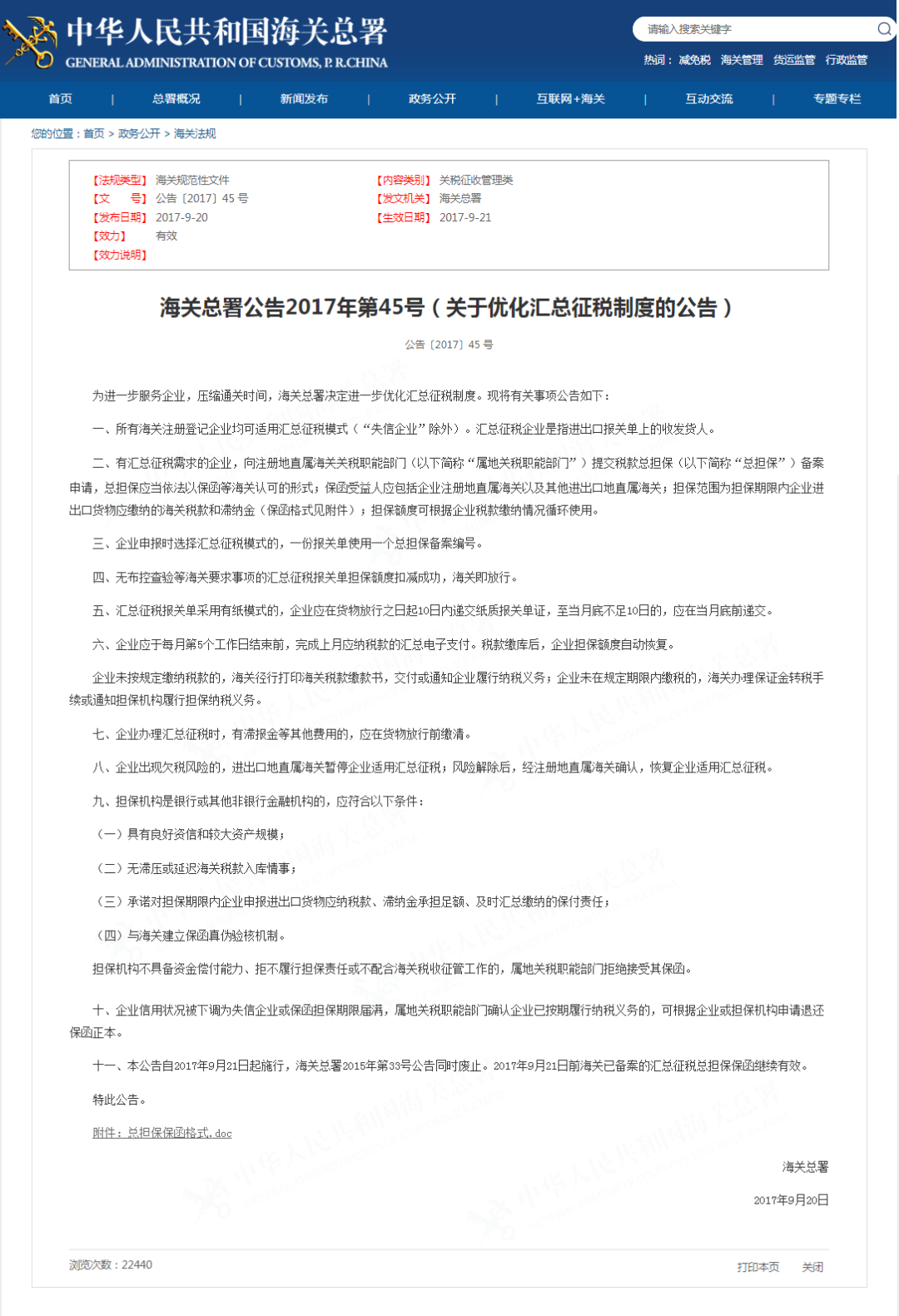 相关政策公告 汇总征税担保形式 银行保函 保函(Letter of Guarantee, L/G)又称保证书,是银行出具的书面数据担保凭证。保证在申请人未能按双方协议履行其责任或义务时,由担保人代其履行一定金额、一定期限范围内的某种支付责任或经济赔偿责任。 关税保证保险 进出口企业投保后,若未能按期向海关缴纳相关税款,将由保险公司进行赔付,即代其履行缴纳义务,是确保海关能收到税款权益的一种保险。 税款保证金 海关为保证企业支付税款,收取一定金额的保证款项,用以在企业未履行海关税款缴纳义务时扣除相应数额作为税款的一种方式。 缺点:产生资金占用。 汇总征税流程 申报 报关单预录入完毕点击申报按钮,添加“汇总征税”标识。 额度扣减及放行 金二系统按应缴税金额扣减总担保中相应额度,扣减完成后如无查验指令,报关单放行。 缴税 每月第5个工作日结束前,通过支付平台操作完成上月应纳税款的汇总电子支付。 额度恢复及税单自行打印 汇总税款电子支付成功后,总担保额度恢复,企业可自行打印税单,税单随附对应报关单。 后续核查 海关对监管期内货物进行后续核查。 汇总征税好处 汇总征税政策实行先放行后补税的方式简化了手续,大大缩短货物的通关时间。 汇总征税政策在每月第5个工作日结束前完成上月应纳税款的汇总电子支付即可,这个规则能降低企业通关资金占用成本,方便企业资金周转。 企业只需要在注册地直属海关使用一份保函备案一次,就可以开通汇总征税总担保全国通用的功能,即实现了“一地备案,全国通用;一份保函,全国通用”。给企业带来了非常大的便利。 担保额度能循环使用,企业申报后,额度自动扣减;企业缴税后,额度自动恢复,无需繁琐的步骤。
